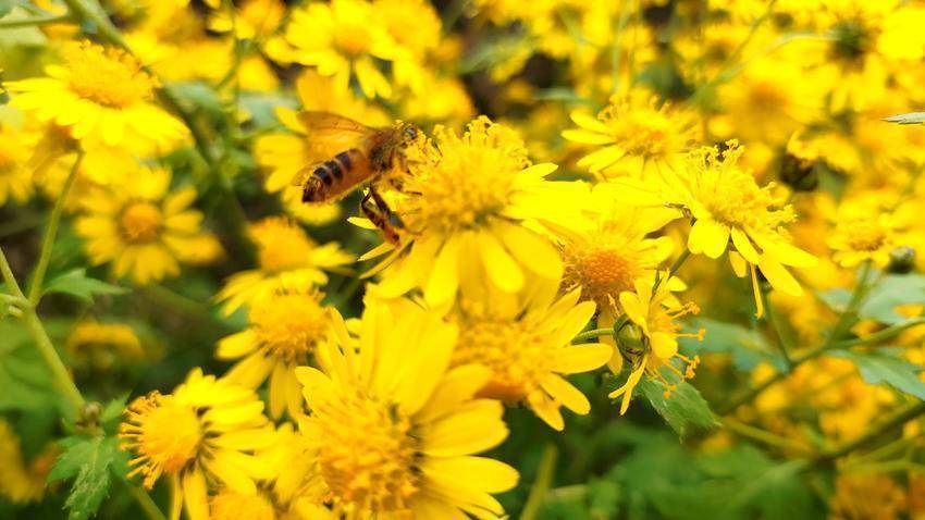 花丛间,几位村民提着竹篮,正弯腰专注地采摘菊花,指尖轻捻,将一朵朵盛放的野菊收入篮中。几只蜜蜂嗡嗡作响,在花丛中穿梭忙碌,与采花人构成一幅灵动的田园画卷。