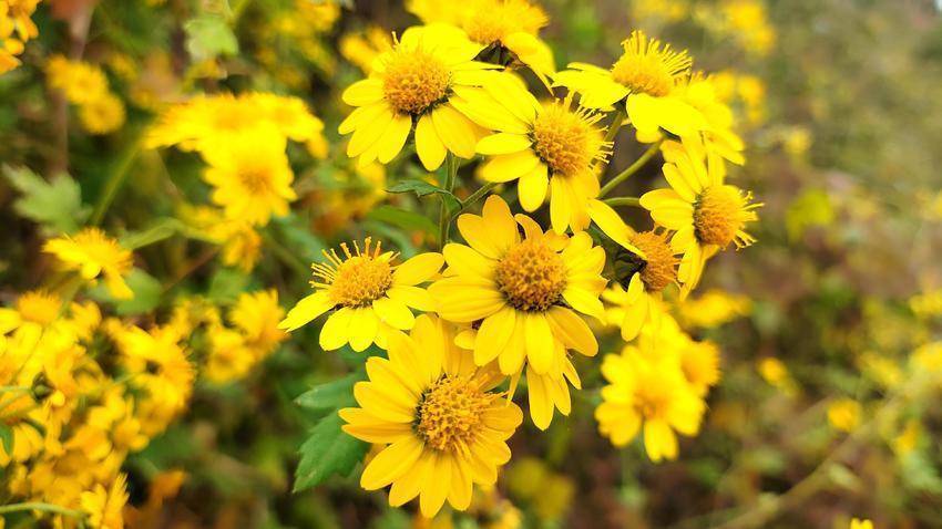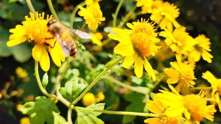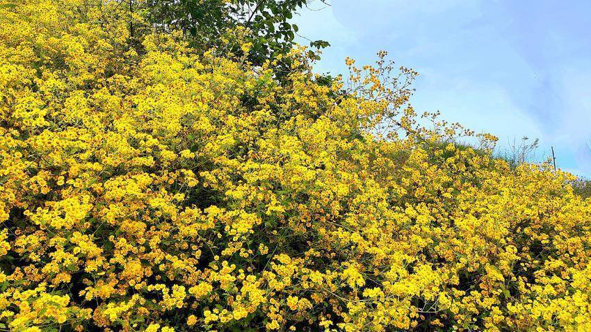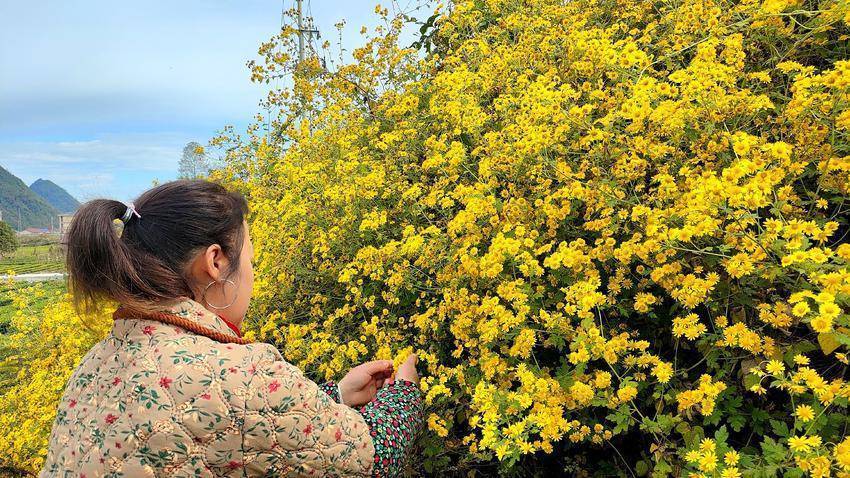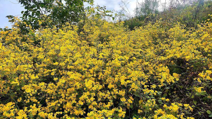 只见村中的沟渠上、田坎边,一片片、一簇簇黄色的野菊花,历经严霜洗礼,依旧傲然绽放。细碎的花瓣缀满枝头,金黄透亮,在阳光下摇曳生姿,尽显坚韧生机。