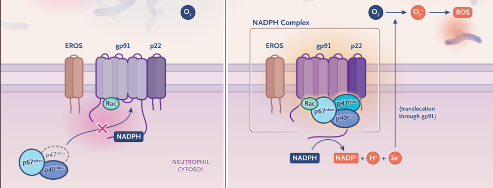 哈佛医学院的研究者发现,CGD患儿的白细胞在吞噬细菌时,无法产生活性氧[5]。正常人的免疫细胞(尤其是吞噬细胞,如中性粒细胞、巨噬细胞)吞噬细菌后会启动“呼吸爆发”(respiratory burst)机制,产生大量超氧化物等活性氧,像化学武器一样摧毁病原体。但CGD患者的细胞虽然能吞噬细菌,却无法将其杀死,就像士兵包围了敌人,却没有武器消灭他们。