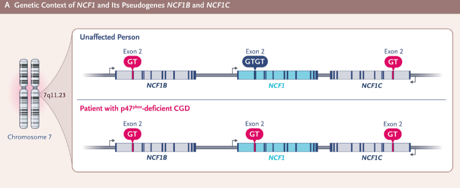 随后几年,其他CGD相关基因陆续被鉴定,其中,像患者Ty带有的NCF1基因(编码p47phox)突变约占20%–25%的病例,是最常见的常染色体隐性类型。与此同时,大约65%–70%病例源自X染色体上的CYBB基因突变[10,11]。