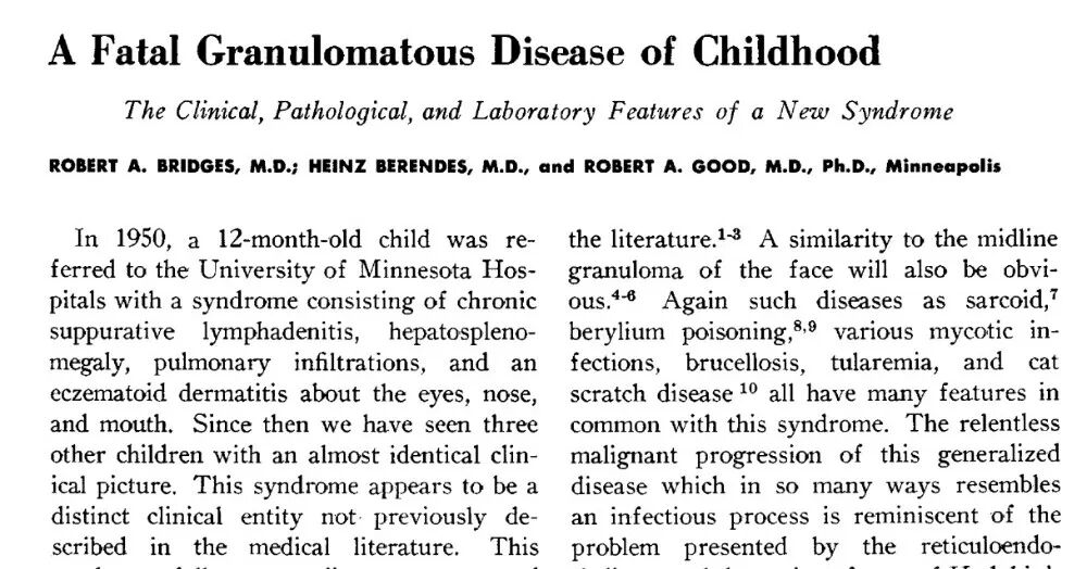 1957年,他们在期刊发表论文,将这种疾病命名为“儿童致命性肉芽肿病”(A Fatal Granulomatosus Disease of Childhood)。1959年,第二篇论文发表时,4名患儿中已有3人死亡。在1960年代,患这种病的孩子7岁前死亡率超过60%,预期寿命不到10岁。