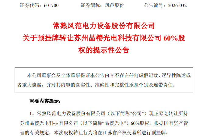 仅仅一天之前,主营电力铁塔的风范股份刚刚发布公告,拟在江苏省产权交易所预挂牌转让所持晶樱光电60%股权。转让一旦完成,意味着这家国资控股上市公司将彻底退出光伏制造行业。