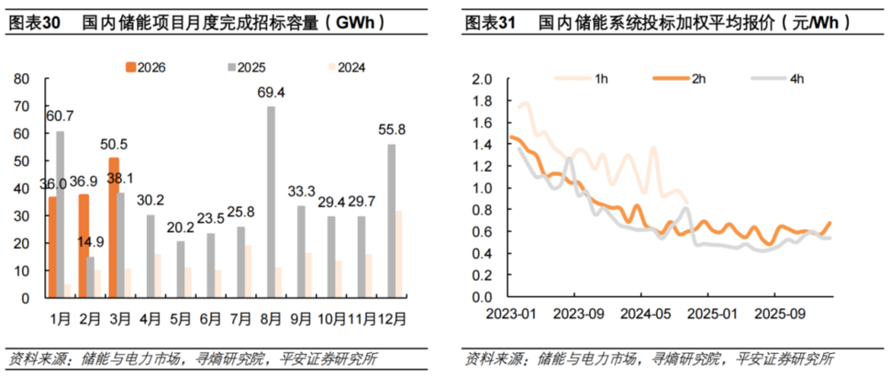 图说:国内储能项目月度完成招标容量及储能系统平均报价