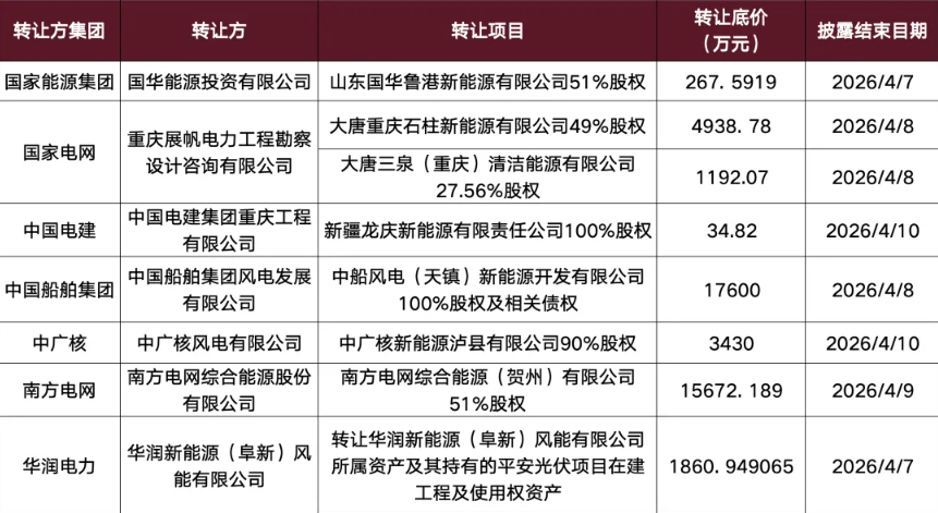 以国家电网为例,4月3日,国家电网挂牌转让三家新能源公司100%股权。其中,山东省英大光伏科技有限公司100%股权,转让底价3230万元。